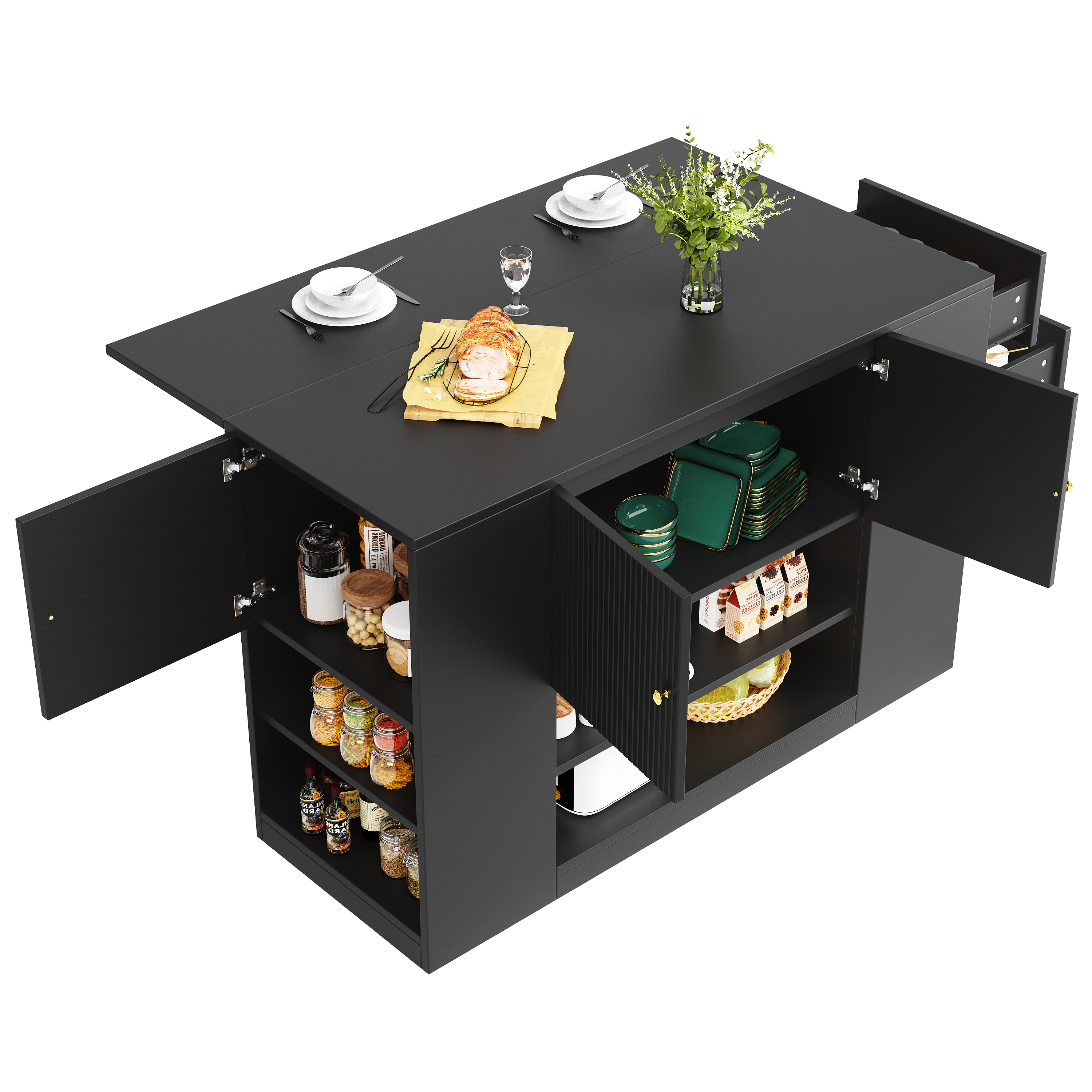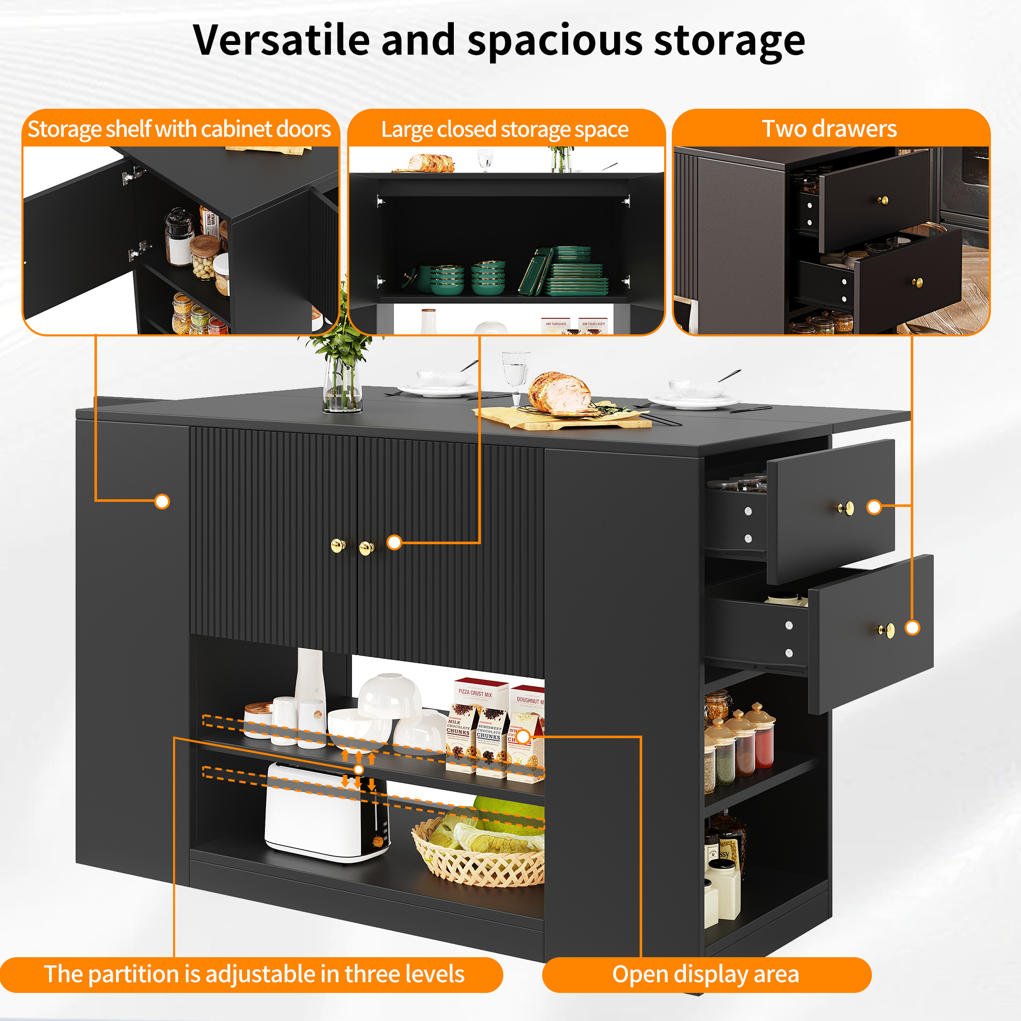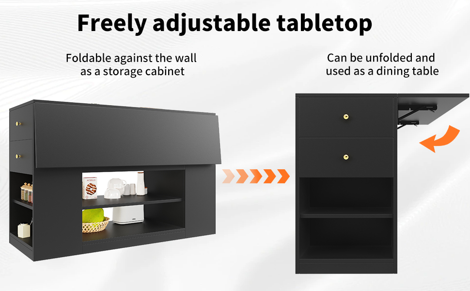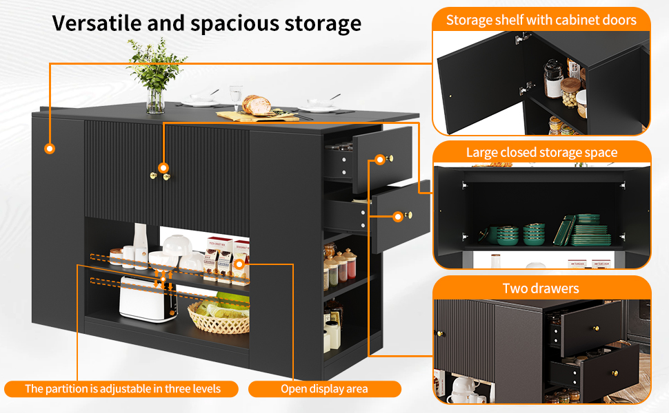 This kitchen island offers plenty of space to bring order and convenience to your kitchen. The two-door cabinet provides easy storage for pots and pans, and the adjustable shelves under the island table can be flexibly adapted to different sizes of items and meet various storage requirements. The drawers and shelves on both sides of the kitchen island keep everything you need for cooking within reach, making your work smoother and more efficient.
